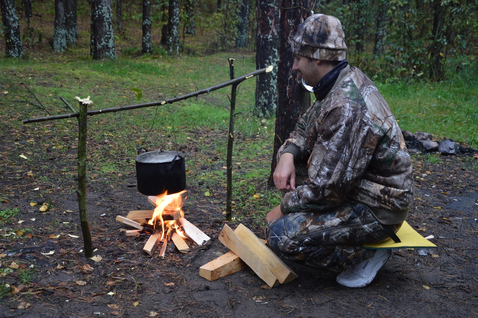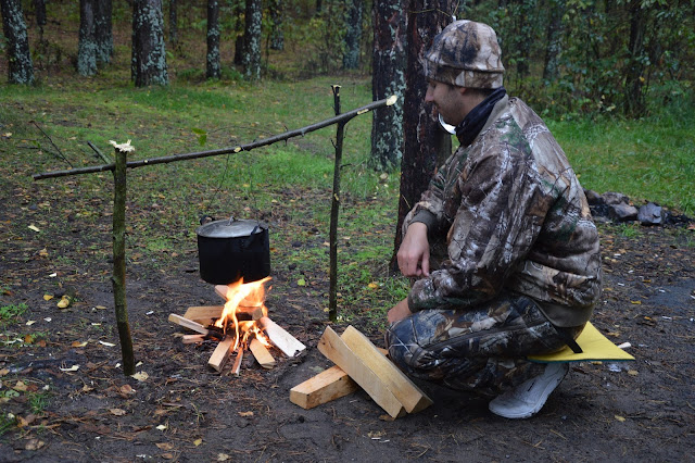 Ну всё — можно ехать домой! Грибов набрали и щуку словили, что ещё нужно для полного счастья — шутим мы между собой. Но руки продолжают бросать а сердце учащённо биться от мыслей что может взять ещё более крупная щука и мы надеемся на удачу, не обращая внимания на сильный дождь и ветер. Вот уже мои носки начинают чавкать от сбегающих в сапоги струек воды, у Паши выливается вода из рукавов, а пол лодки покрылся водой, по спинам пробегает дрожь — но большие силиконоые приманки весом в 100 грамм раз за разом летят в воду. Тишина… Решаем что нужно сделать паузу и скушать… грибов! Вот мы уже на базе разжигаем костёр.