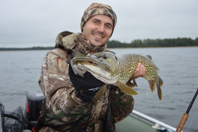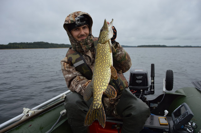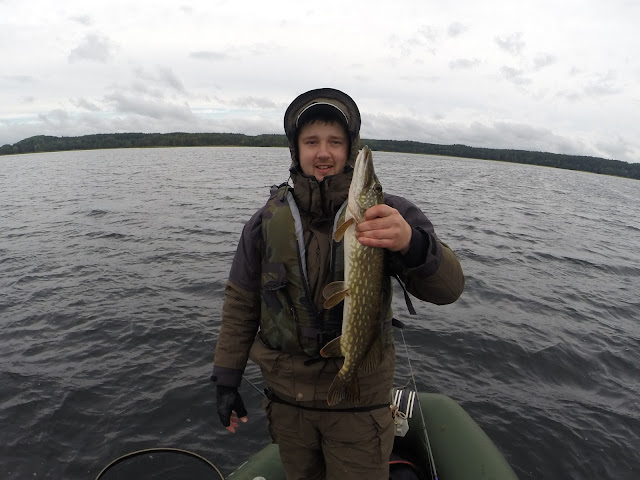 Вот мы снова рассекаем волну в надежде на вечерний выход. Наконец-то затих дождь! Проверяем новые места и я сразу ловлю хорошую щуку в 2,5 кг на McRubber