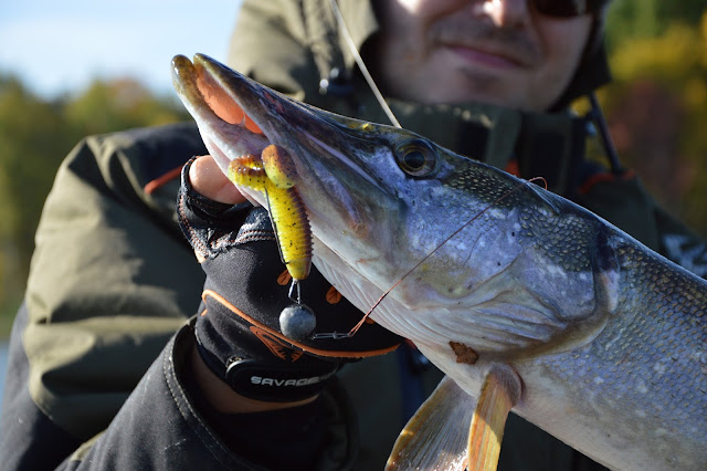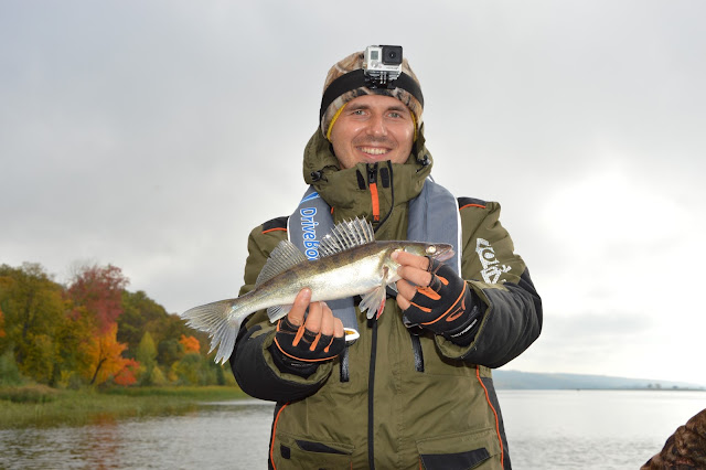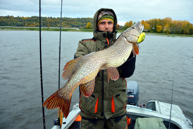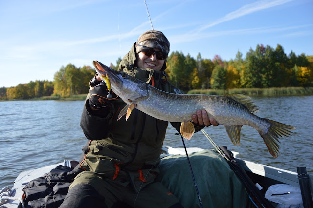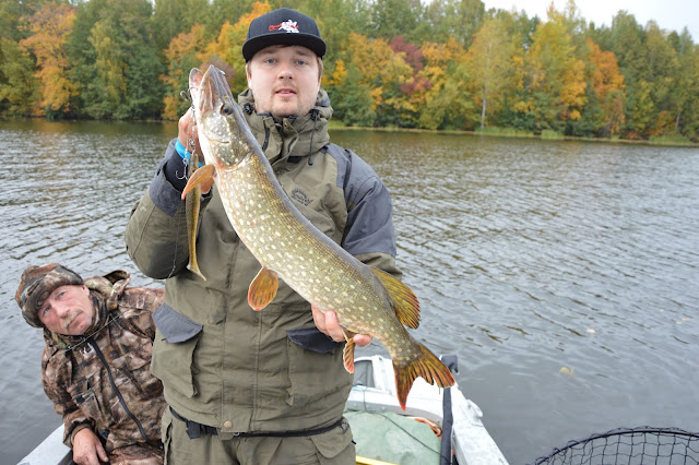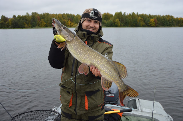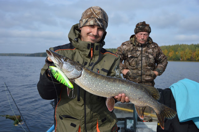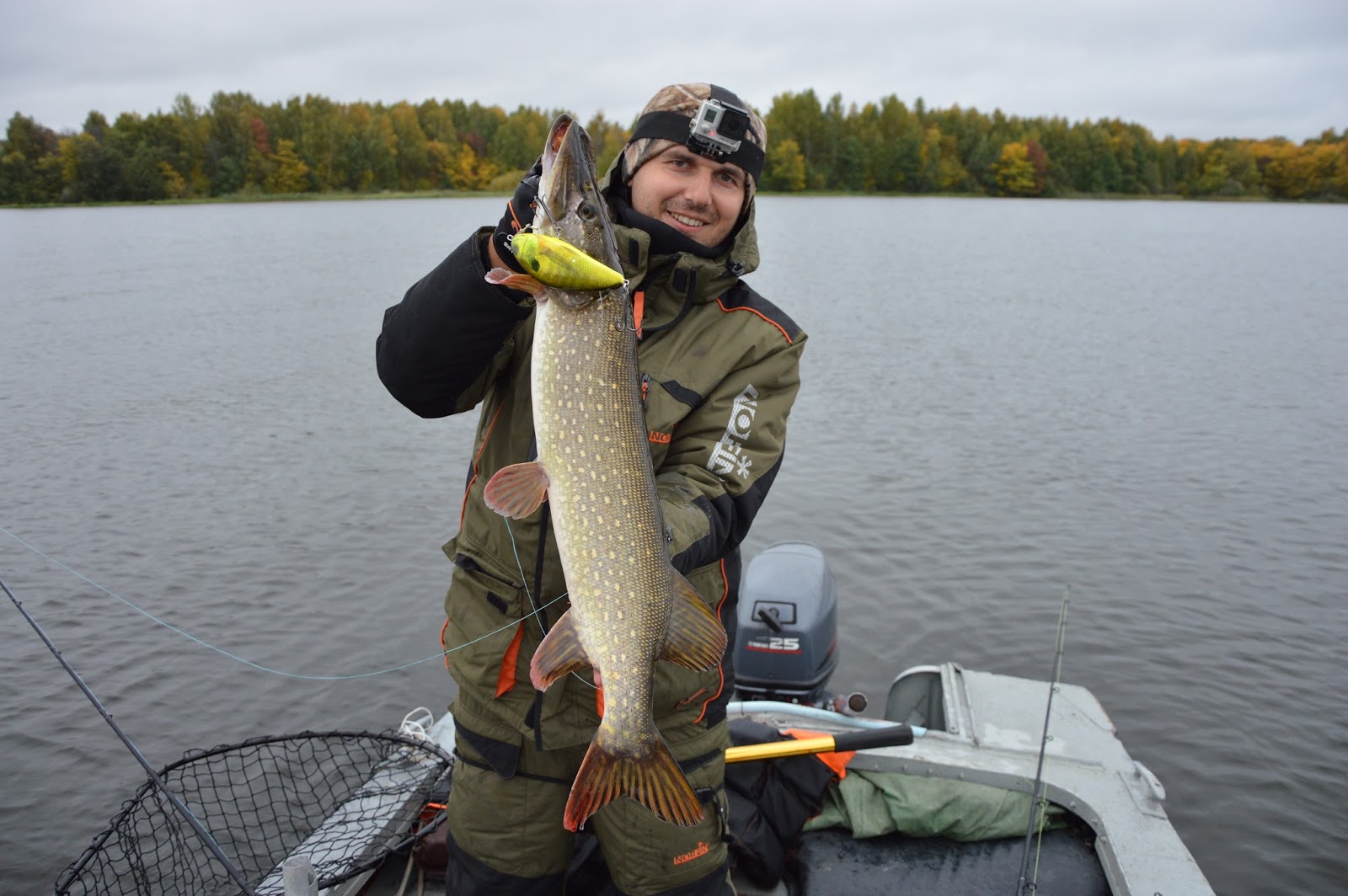 Бескрайние заливы с корягами и островами. А разноцветные осенние деревья с подающими на воду листьями только добавляют колорита. Ну что же, в бой! Buster Jerk первый отправляется в воду, потом и другие бойцы. После часа полоскания старых и новых джерков меня отпускает и уже не кажется что тут под каждым пеньком должна быть щука. Ставлю новый джеркбейт окунь от Sib Baits только вчера доставленный мне Леонидом и на n-м забросе недалеко от лодки кто-то делает лёгкий тук, веду джерк дальше и возле самой лодки замечаю что за ним идёт щука, ещё пару рывков и она хватает джерк под самой лодкой. Не успев включить камеру забираю её в подсак.