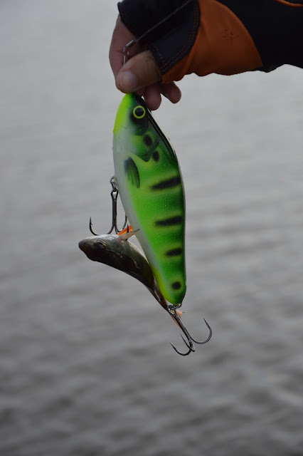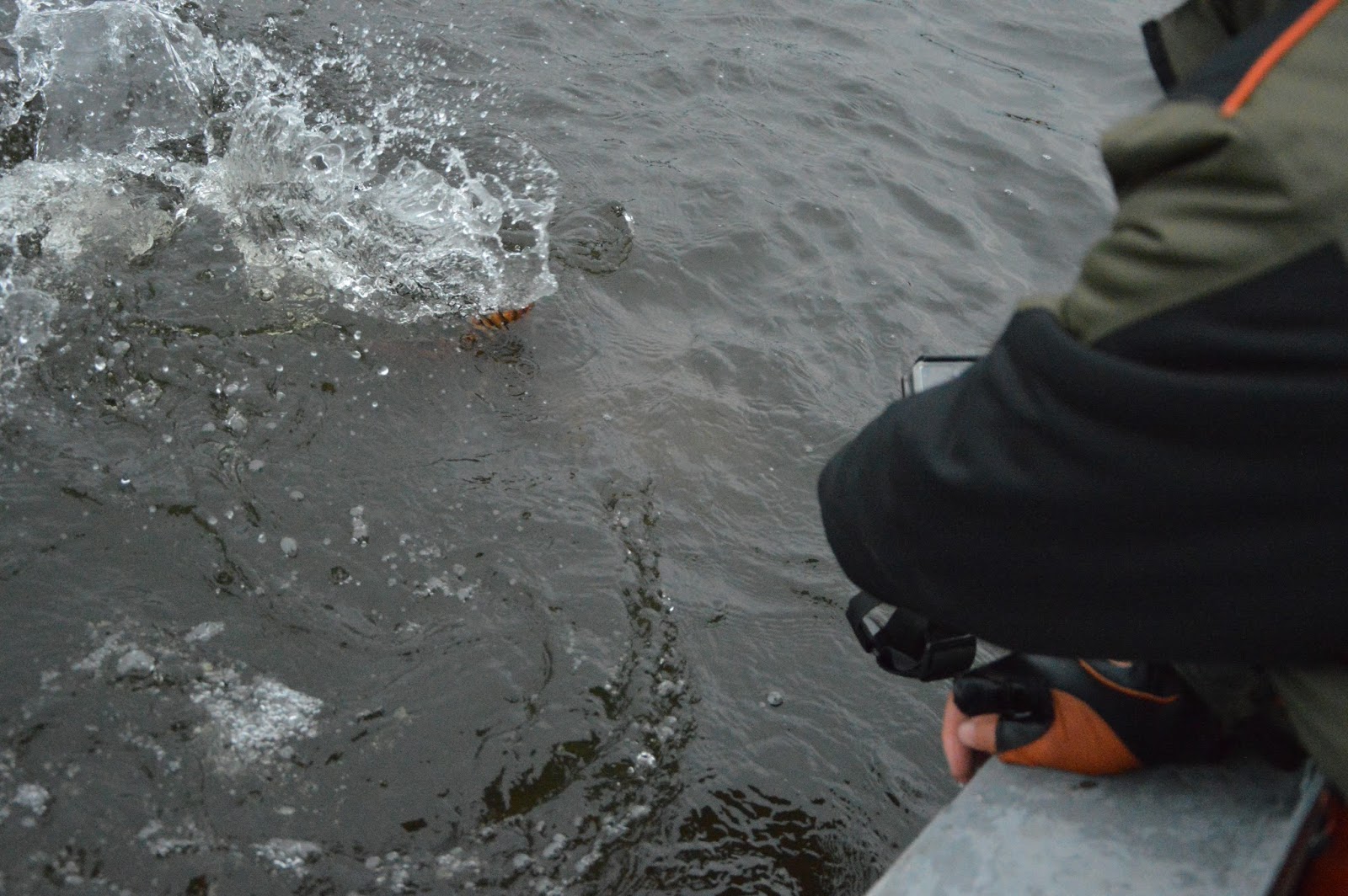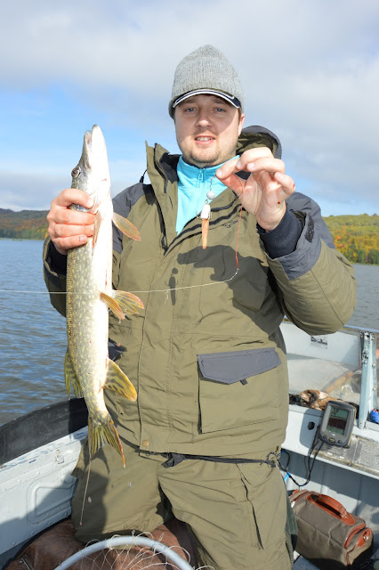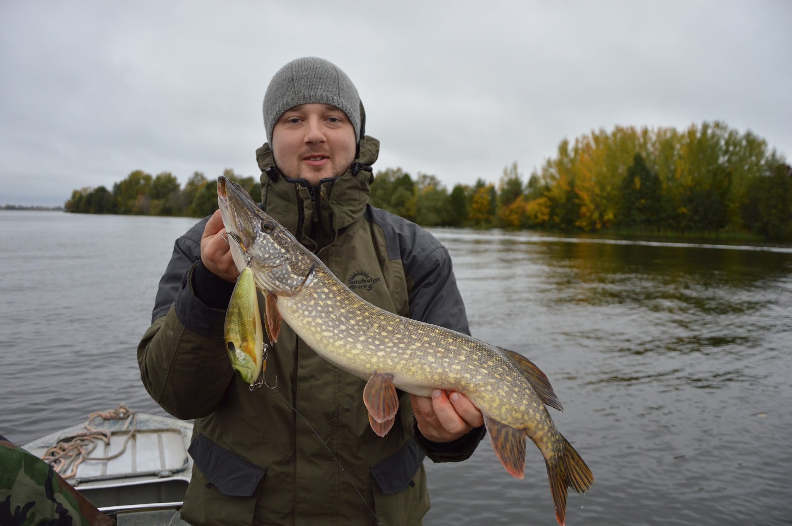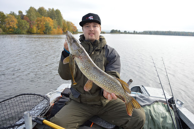 Бескрайние заливы с корягами и островами. А разноцветные осенние деревья с подающими на воду листьями только добавляют колорита. Ну что же, в бой! Buster Jerk первый отправляется в воду, потом и другие бойцы. После часа полоскания старых и новых джерков меня отпускает и уже не кажется что тут под каждым пеньком должна быть щука. Ставлю новый джеркбейт окунь от Sib Baits только вчера доставленный мне Леонидом и на n-м забросе недалеко от лодки кто-то делает лёгкий тук, веду джерк дальше и возле самой лодки замечаю что за ним идёт щука, ещё пару рывков и она хватает джерк под самой лодкой. Не успев включить камеру забираю её в подсак.