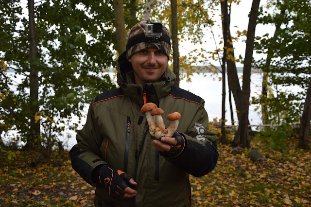 Пора обедать, причаливаем к одному из островов и сразу замечаем море грибов. Есть и старые белые грибы. За пять минут с островка 10*20 метров собираем 40 штук молодых подосиновиков.