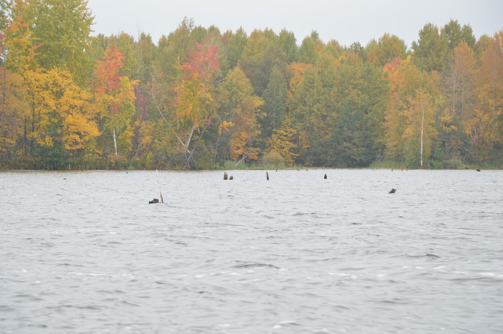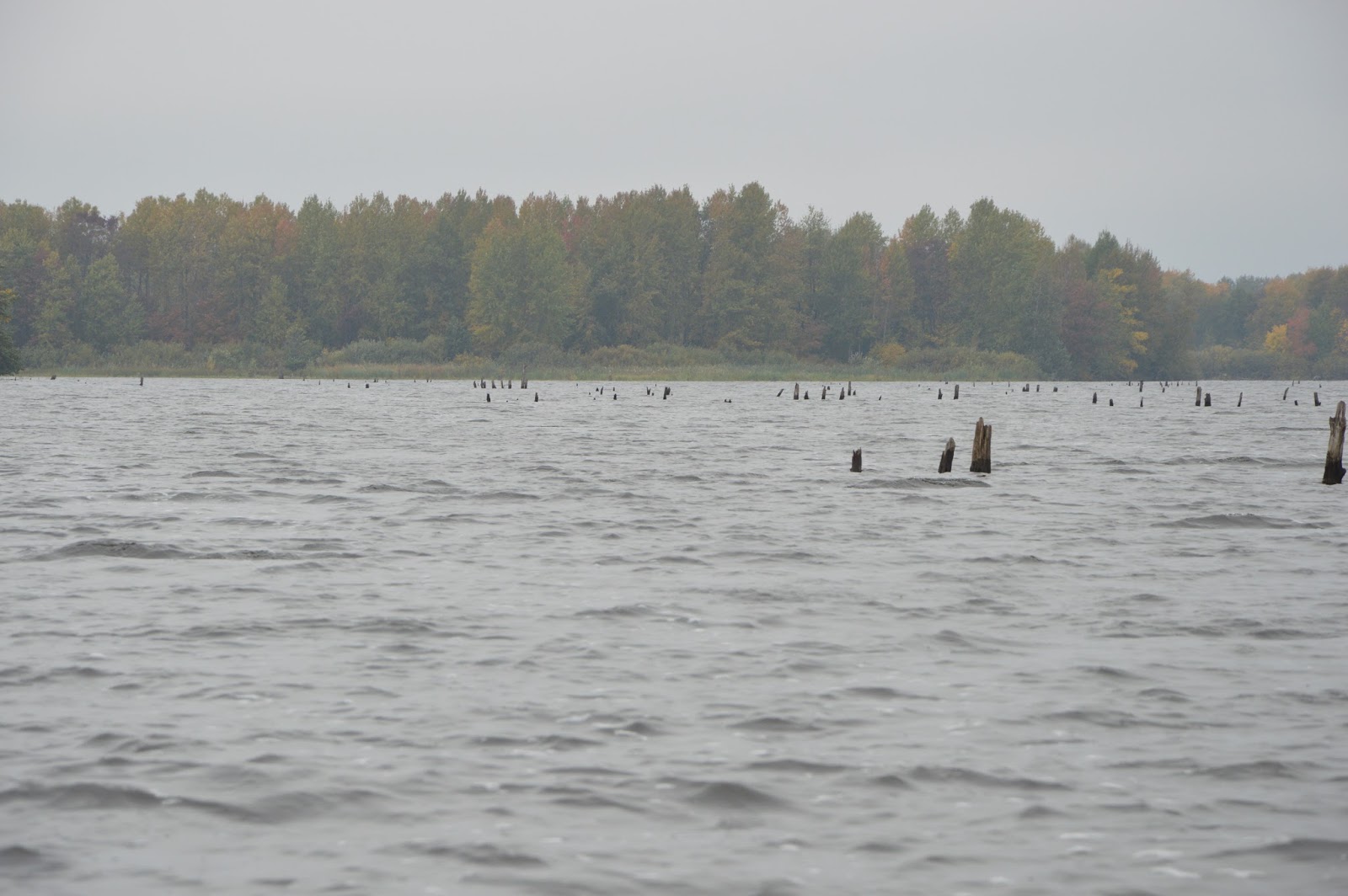 День второй встретил нас сильным холодным ветром. Пытались дойти до вчерашних мест но не смогли из-за большой встречной волны и опасности столкновения с пнями. На обратом пути останавливались и на 22-м и в Хмелевке, но везде было тихо. Я предложил сходить во всем известную Коноплинку, очень хотелось отметиться и там. Серёга сказал что можно и ветер сильно мешать не должен. Через час мы уже ловили в Конопле. Длинная глубокая канава, травяные косы и поляны из пней. Вроде всё что нужно щуке но у нас без поклёвок. Опять перебрал целое ведро джерков, но тишина. Я отчаялся, говорю егерю: что делать? Он говорит поехали обратно к базе в Луковку где вчера щука у тебя сошла — доловим её. Я согласился, по пути проверили ещё пару прибрежных кос и ямок — но тишина.