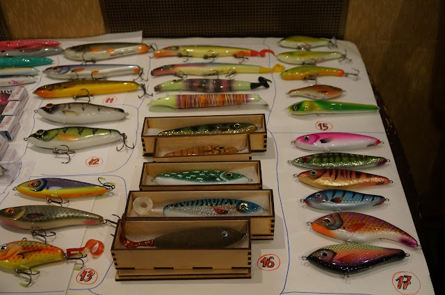 Вечером нас ждала выставка джеркбейтов ручной работы аж 17 мастеров из России и Беларуси. Глаза аж разбегались от разнообразия форм и цветов. Каждый мастер был представлен и в конце было голосование на приз зрительских симпатий.